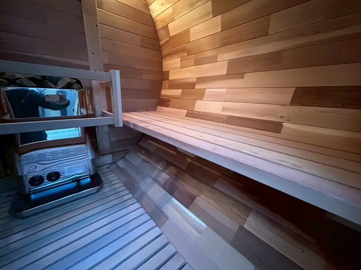 ロウリュ可能な電気ストーブで、木材はレッドシダーになります。