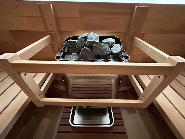 ロウリュ可能な電気ストーブで、ハーフ窓、木材はレッドシダーになります。