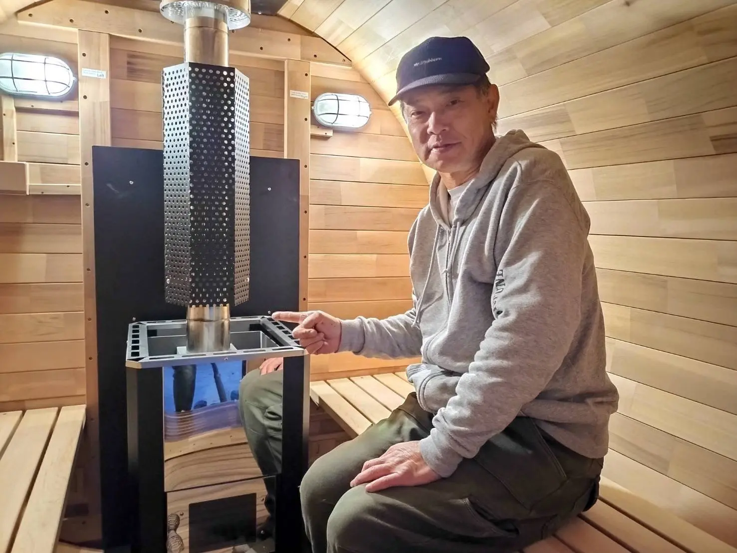 ロウリュ可能な薪ストーブで、木材はレッドシダーになります。