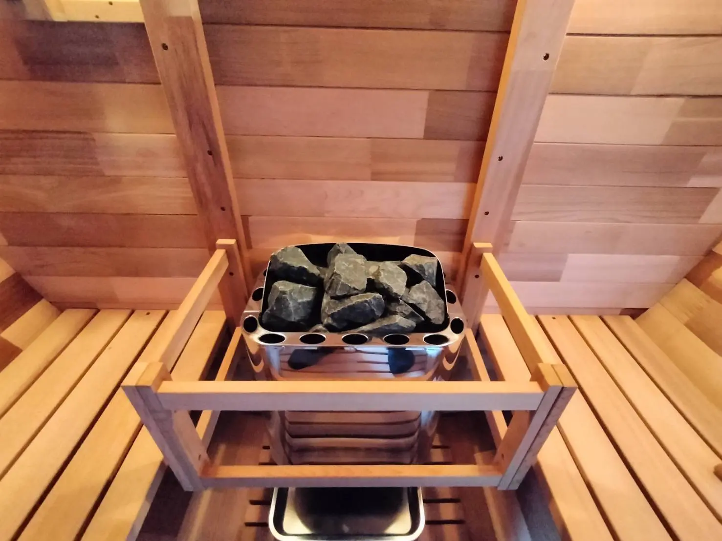 ロウリュ可能な電気ストーブで、木材はレッドシダーになります。